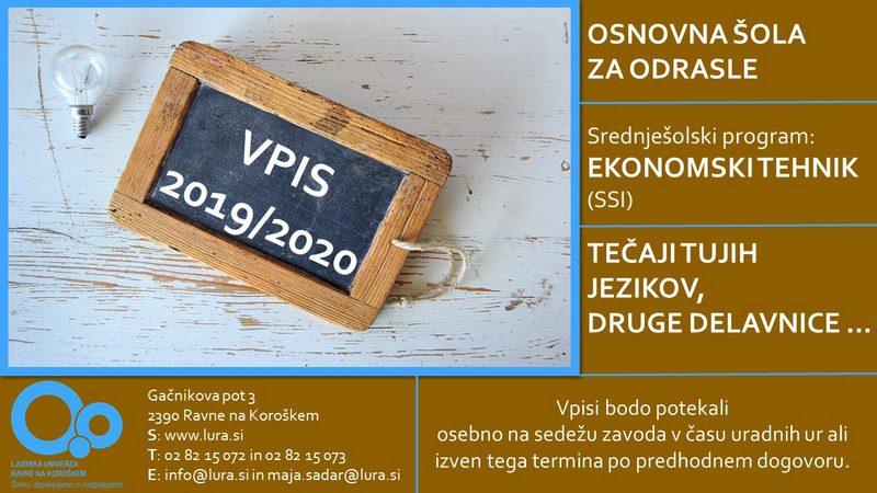 Vpis v šolsko leto 2019/2020 še vedno poteka. Pokličite (02 82 15 072), pišite (maja.sadar@lura.si) ali še preprosto oglasite pri …