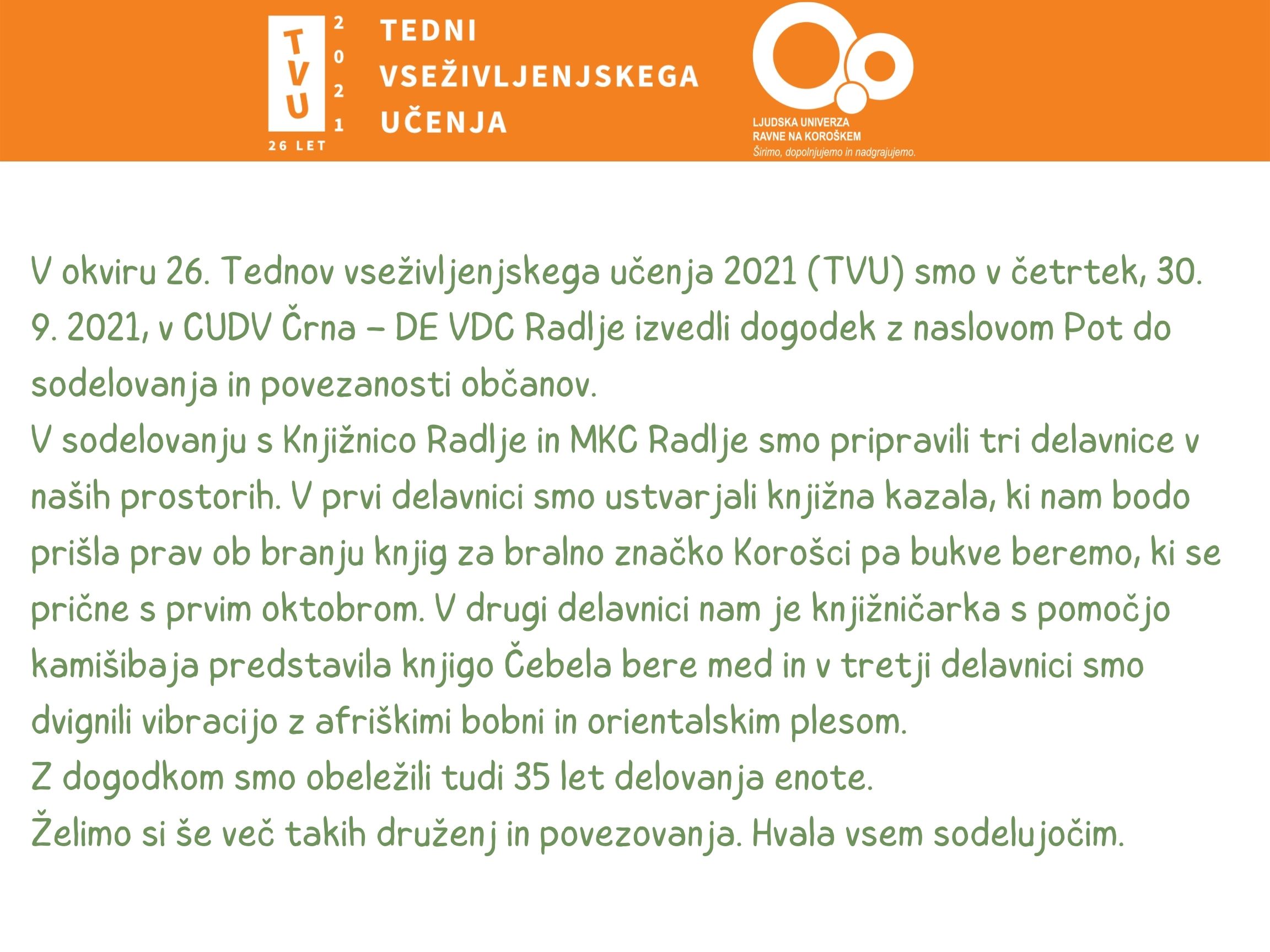- Osrednja prireditev TVU 2021 > Učenje vedno najde pot > 14. 9. 2021, grajski vrt Koroške osrednje knjižnice dr. Franca Sušnika na Ravnah na Koroškem > https://lura.si/utrinki/galerija/330-tvu-2021-osrednja-prireditev-26-tednov-vsezivljenjskega-ucenja-ucenje-vedno-najde-pot-14-9-2021-ravne-na-koroskem
