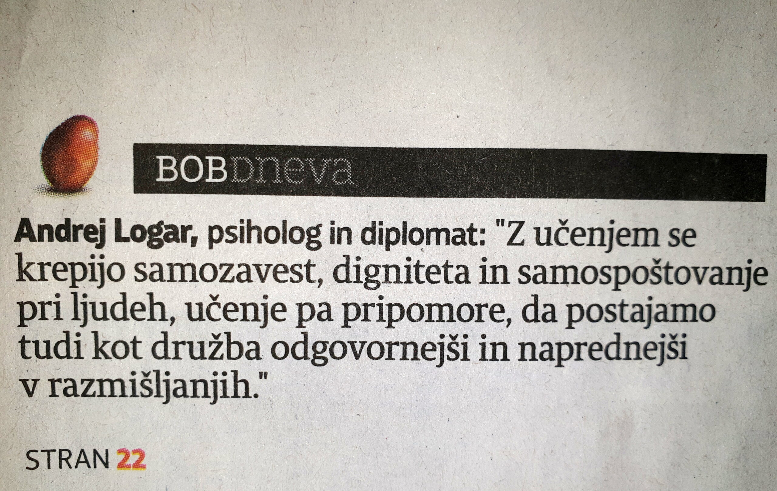 Obsežno poročilo o našem osrednjem dogodku TVU 2021 je bilo tudi v časopisu Večer (17. 9. 2021, str. 22), kjer je izjava g. Logarja, našega ambasadorja vseživljenjskega učenja, bila izbrala tudi za Večerov bob dneva in je bila zapisana na njegovi prvi strani. Rekel je: »Z učenjem se krepijo samozavest, digniteta in samospoštovanje pri ljudeh, učenje pa pripomore, da postajamo tudi kot družba odgovornejši in naprednejši v razmišljanjih.«