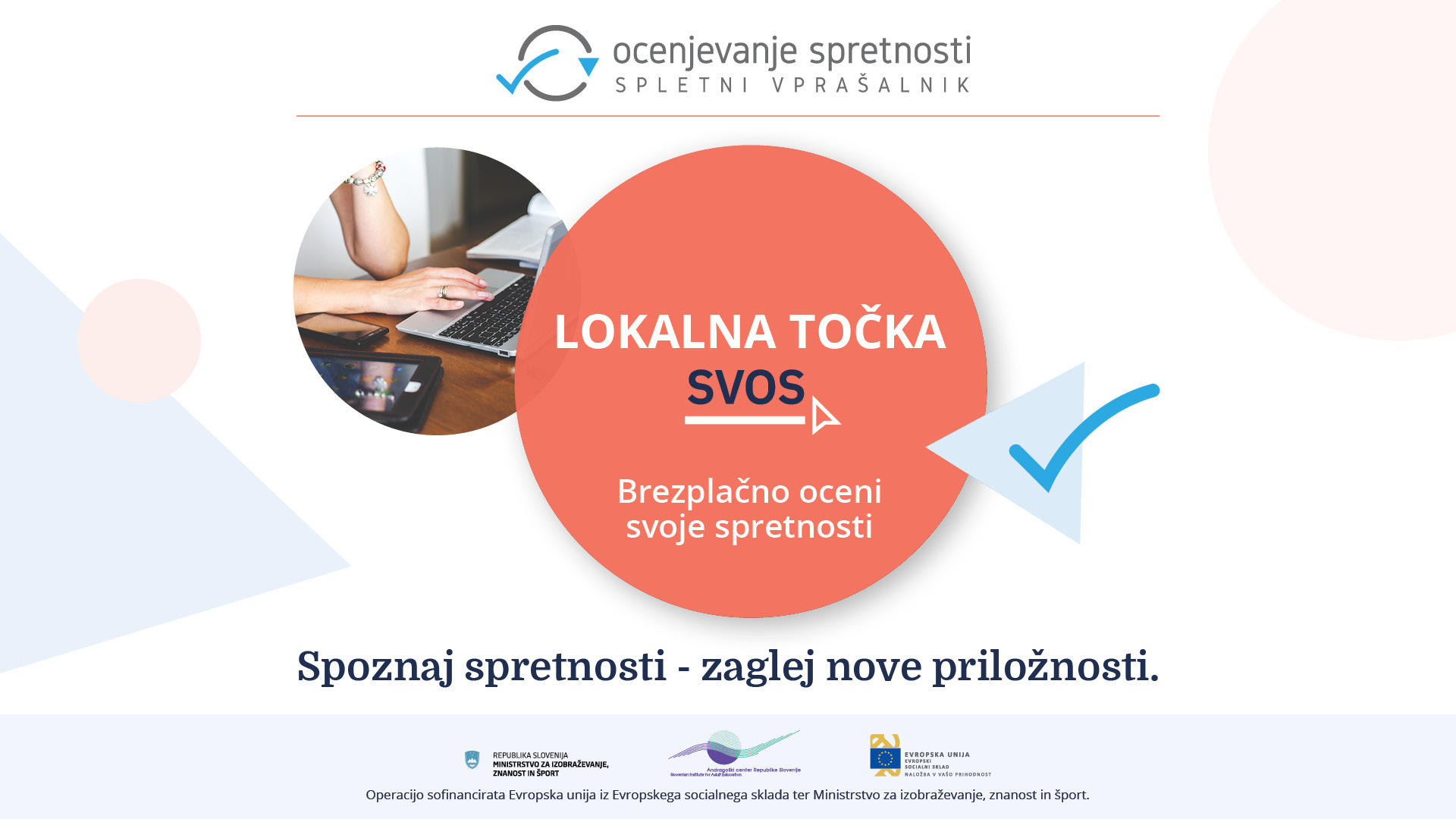 V okviru Koroškega informacijskega in svetovalnega središča – KISS deluje lokalna točka SVOS (Spletni Vprašalnik Ocenjevanje Spretnosti), ki vam omogoča brezplačno oceno lastnih spretnosti. Rezultati ocenjevanja vam bodo v pomoč pri odločitvah za nadaljnje učenje in izobraževanje ali pri spremembi poklicne poti.