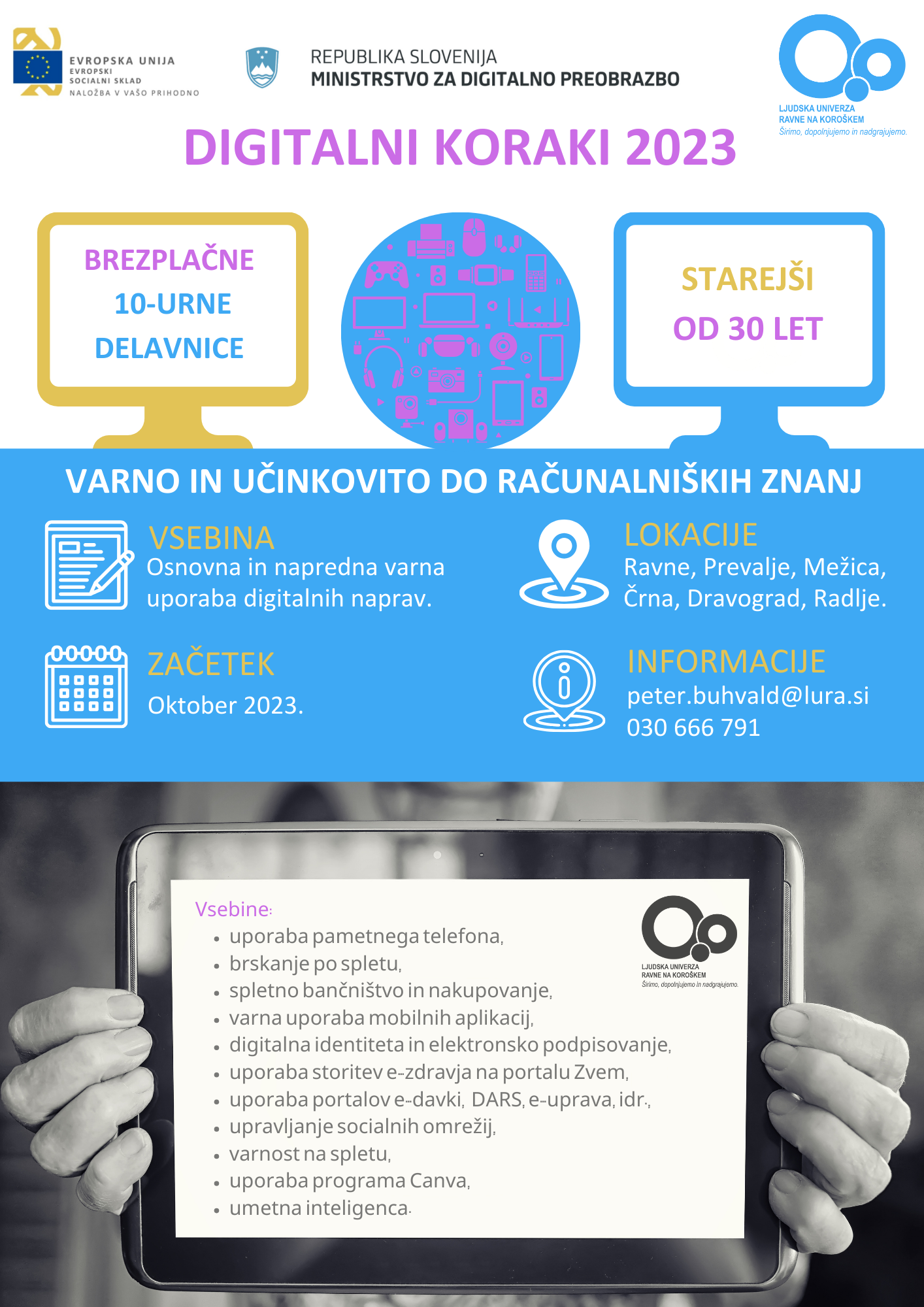 Ljudska univerza Ravne na Koroškem sodeluje v konzorciju kot izvajalka brezplačnih delavnic digitalne pismenosti za udeležence. Nosilec projekta je Javni zavod Cene Štupar –  Center za izobraževanje Ljubljana. Projekt sofinancirata Republika Slovenija, Ministrstvo za digitalno preobrazbo in Evropska unija iz Evropskega socialnega sklada v okviru odziva Unije na pandemijo COVID-19.