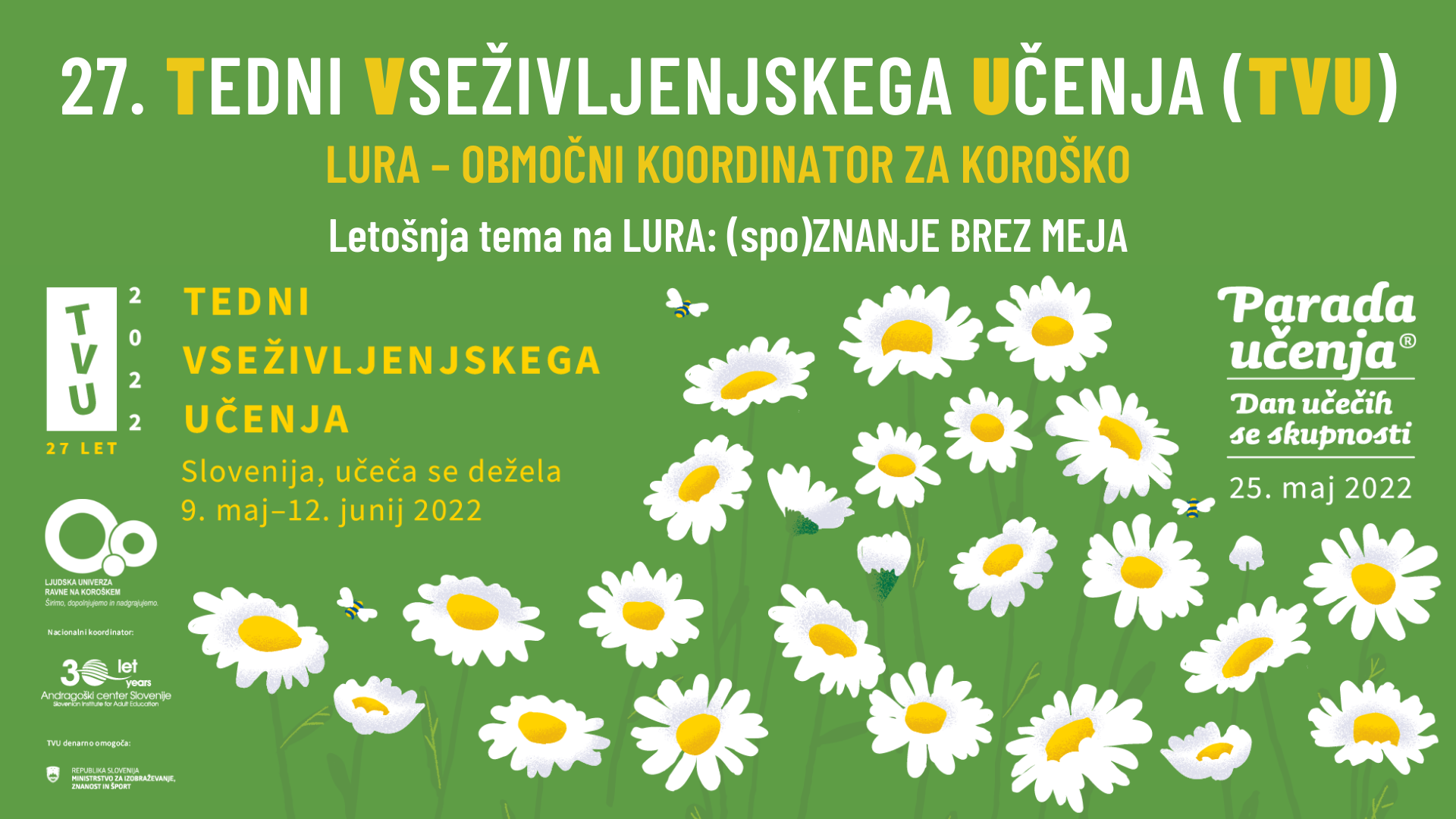 Ljudska univerza Ravne na Koroškem (LURA) je ponovno postala tudi OBMOČNI KOORDINATOR 27. TEDNOV VSEŽIVLJENJSKEGA UČENJA (TVU) ZA KOROŠKO. Gre za največjo in najvidnejšo promocijo vseživljenjskega učenja v Sloveniji. Festival se bo letos odvijal v času od 9. maja do 12. junija 2022, lokalna tema našega zavoda in naših številnih partnerjev širom Koroške, ki bodo z nami soustvarjali dogajanje, dogodke, prireditve, pa bo “(spo)ZNANJE BREZ MEJA“.